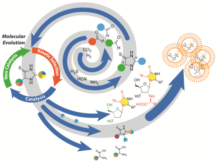 The goal of this project is to investigate a hitherto unknown level of prebiotic chemistry, namely the organocatalytic and evolutionary properties of imidazolidine-4-thiones, which are formed in excellent yields under prebiotic conditions from the simplest aldehyde building blocks. This project will investigate the modification of such imidazolidine-4-thiones with (deoxy)-ribosyl units, analogous to DNA/RNA, to synthesize RNA/DNA nucleoside amino acid chimeras under prebiotic conditions. The catalytic and information storing properties of these organocatalyst riboglycoside chimeras will be studied in detail.